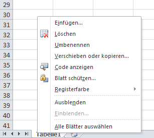 Sie können Tabellenblätter einfügen, löschen, umbenennen, verschieben, kopieren und gruppieren sowie eine Registerfarbe vergeben. Nutzen Sie hierfür das Kontextmenü: Klicken Sie mit der rechten Maustaste auf das entsprechende Tabellenblattregister, um das Menü zu erhalten.