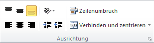Für die Textausrichtung gibt es entsprechende Symbole in der Gruppe Ausrichtung. Bei der Ausrichtung des Zellinhaltes gibt es Möglichkeiten für die horizontale (links-, rechtsbündig, zentriert) und vertikale (oben, zentriert, unten) Ausrichtung. Ist das Symbol Zeilenumbruch aktiviert, wird der Inhalt einer Zelle umgebrochen, wenn die Zelle nicht breit genug für den Inhalt ist. Excel bricht allerdings "selbstständig" um - ohne irgend eine Trennregel zu beachten.