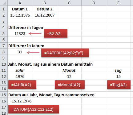 Die Funktionen JAHR(Zahl), MONAT(Zahl) und TAG(Zahl) geben aus einem Datum jeweils Jahr, Monat oder Tag zurück. Mit der Funktion DATUM(Jahr;Monat;Tag) kann ein Datum aus einzelnen Teilen zusammengesetzt werden.