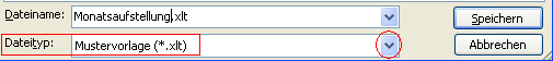 Speichern Sie die Arbeitsmappe anschließend unter einem aussagekräftigen Namen. Wählen Sie als Datentyp "Mustervorlage (.xlt)" aus.